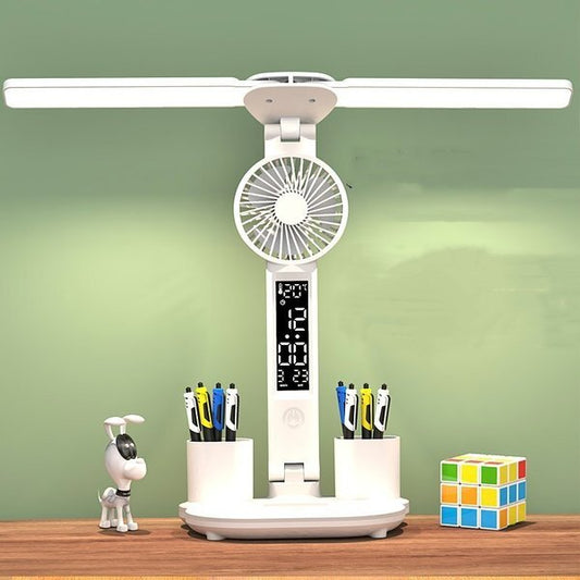 3-in-1 Multifunction LED Table Lamp - Four-Headed Folding Design with Fan, Calendar, Clock, USB Rechargeable Desk Light, and 3-Color Reading Lamp